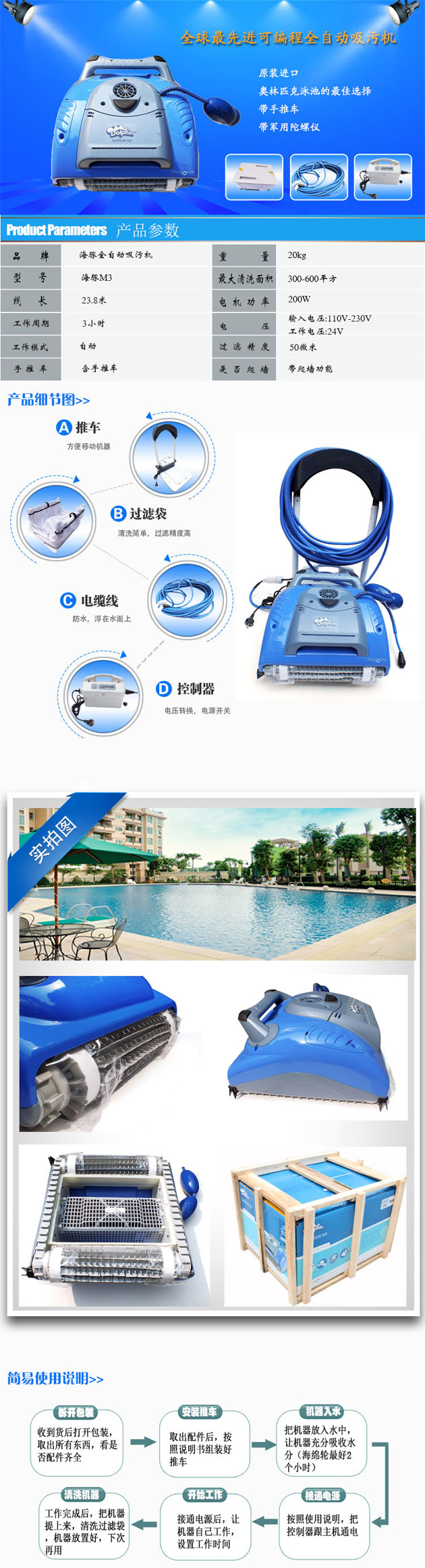 海豚M3全自動泳池吸污機能夠給你提供一個數小時干凈、清澈、衛生的泳池享受。