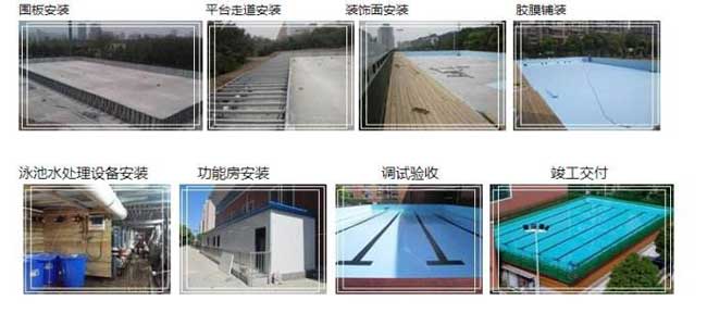 在確定實施方案后工廠組織生產,拼裝式游泳池的各部件均在工廠生產完成,完成生產后一次性運至安裝現(xiàn)場進行整體組裝。安裝前需要一塊平整、堅實的空曠場地,使用方提供安全的380V高壓電(30-50KW),上下水市政管路。安裝過程為15-25天(根據泳池大小而定)。